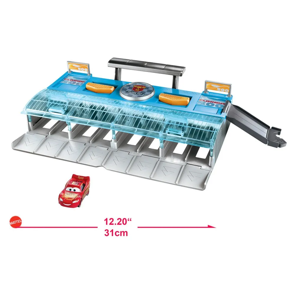 ¡Disfruta de las emocionantes carreras de Cars de Disney- Pixar con este lanzador de ocho carriles! Pon tus coches en la línea de salida y luego lánzalos a toda velocidad.
