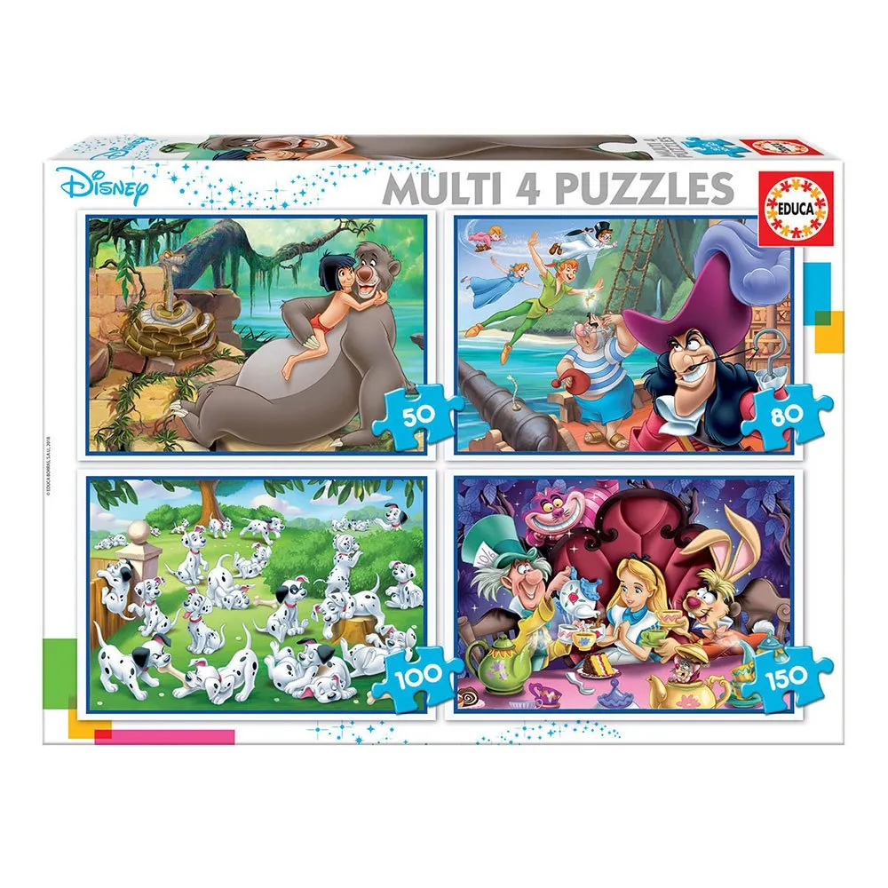 Educa MultiPuzzle Clásicos de Disney contiene 4 puzzles con diferente número de piezas (entre 50 y 150) para que los más pequeños se atrevan con distintos niveles de dificultad.