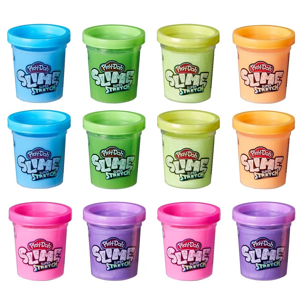 ¡Mira cuánto puedes separar la plastilina súper elástica y súper satisfactoria de Play-Doh Slime Super Stretch! Este multipack de 12 botes tiene 6 colores con 2 cada uno de rosa chicle, morado metálico, azul, amarillo metálico, verde lima y naranja neón.