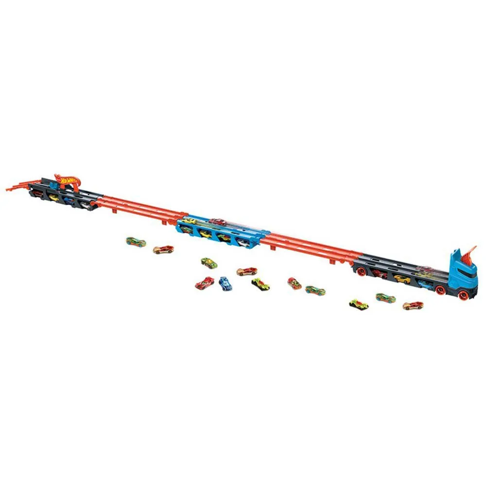 El camión de transporte y pista de Hot Wheels® redefine el almacenamiento y las carreras de Hot Wheels® con un increíble camión lleno de sorpresas.