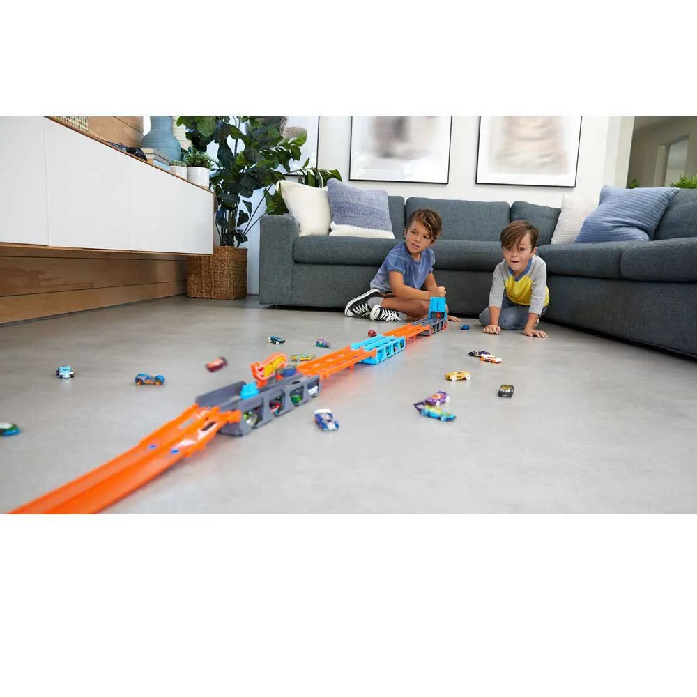 El vehículo multifunción incluye tres vehículos Hot Wheels® a escala 1:64 y puede almacenar 20 coches más (se venden por separado).