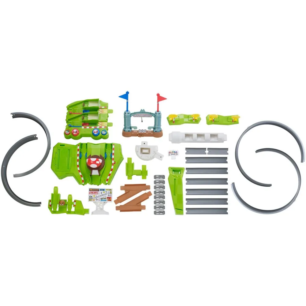 El conjunto incluye banderas de contador de vueltas, un propulsor, obstáculos de caparazones verdes para derribar a tus rivales y mucho más.