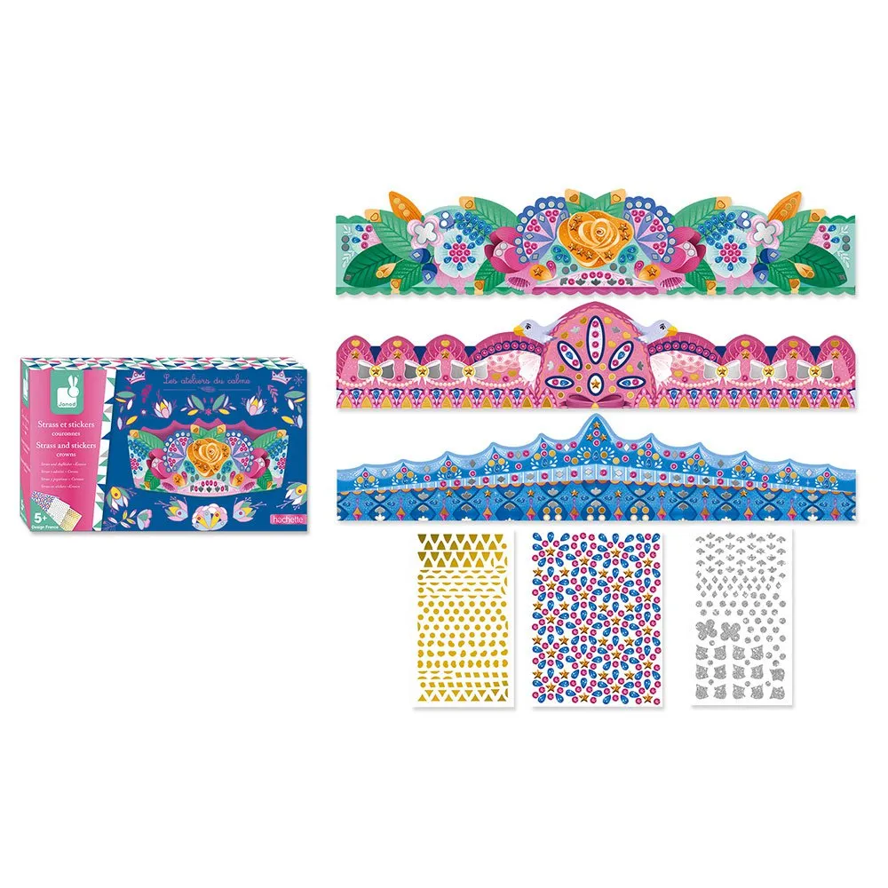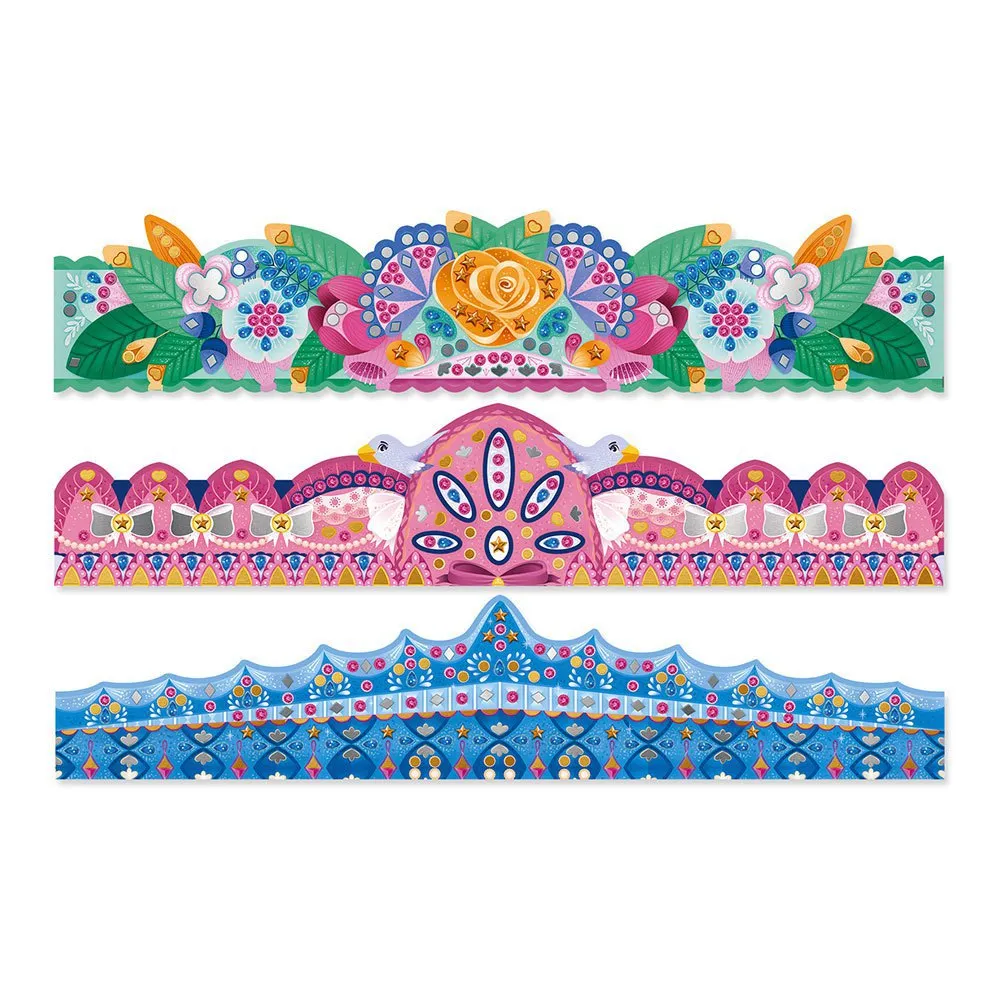3 coronas a decorar con strass, autoadhesivos de lentejuelas y metalizados y 1 manual con modelos y instrucciones.