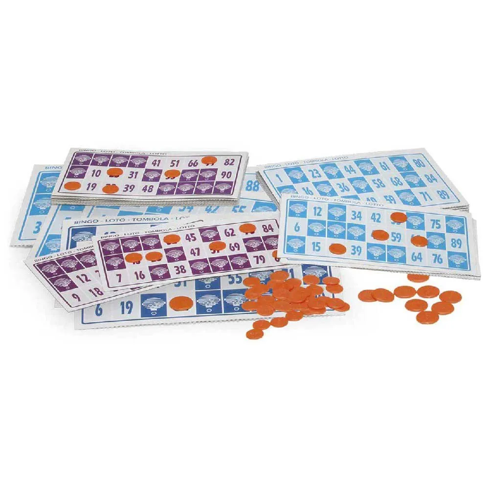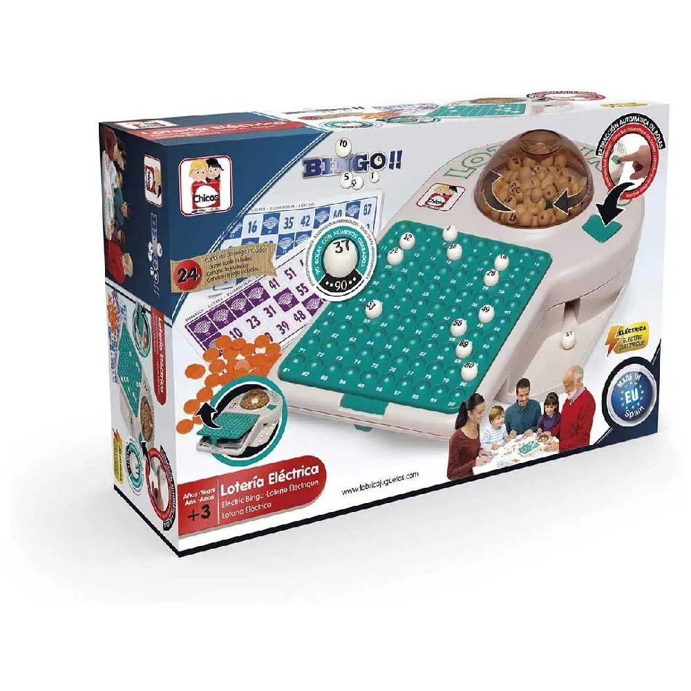 Lotería eléctrica que contiene 90 bolas numeradas, 24 cartones y fichas de juego y con alojamiento para guardar las fichas y cartones.