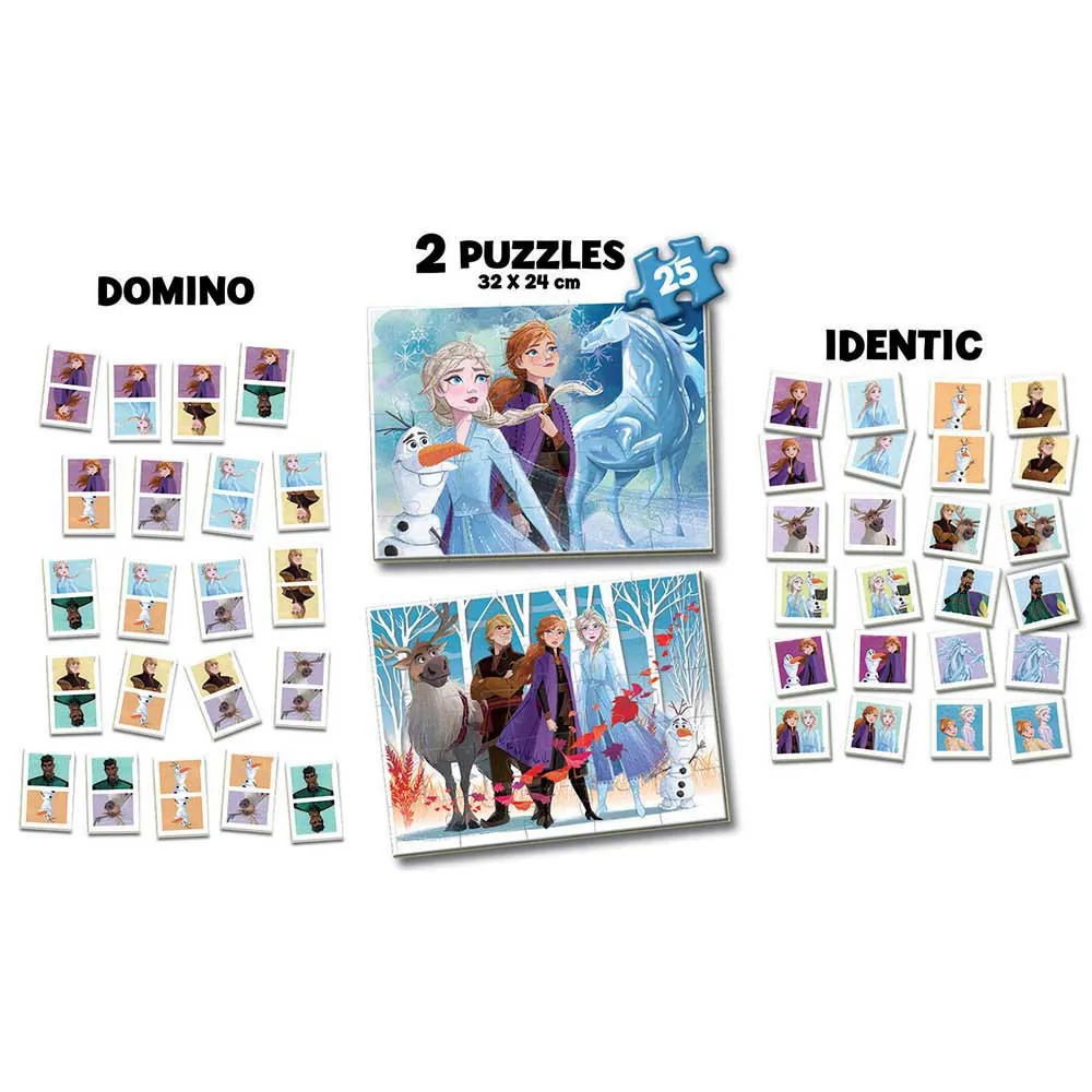 Frozen II Superpack 4 en 1 es unua caja llena de diversión y educación con múltiples posibilidades de juego para jugar solo o acompañado contiene 2 puzzles de 25 piezas, 1 juego de memoria de 24 cartas y 1 domino de 21 piezas , todas decoradas con dibujos de los personajes de Frozen II a todo color.