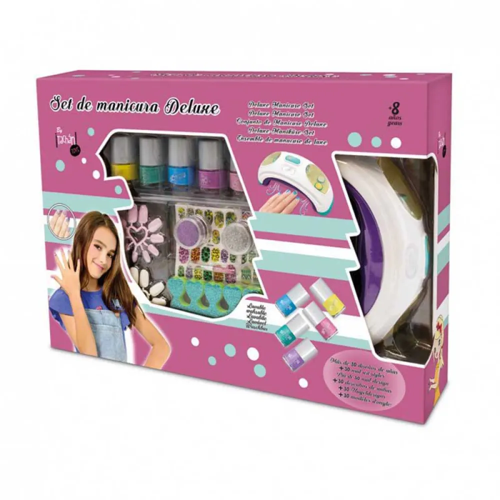 Set de manicura deluxe con secador portátil con compartimento para guardar accesorios. El set también incluye uñas postizas, pegatinas, purpurina y 5 botes de esmalte de colores. No recomendado para niños menores de 8 años.